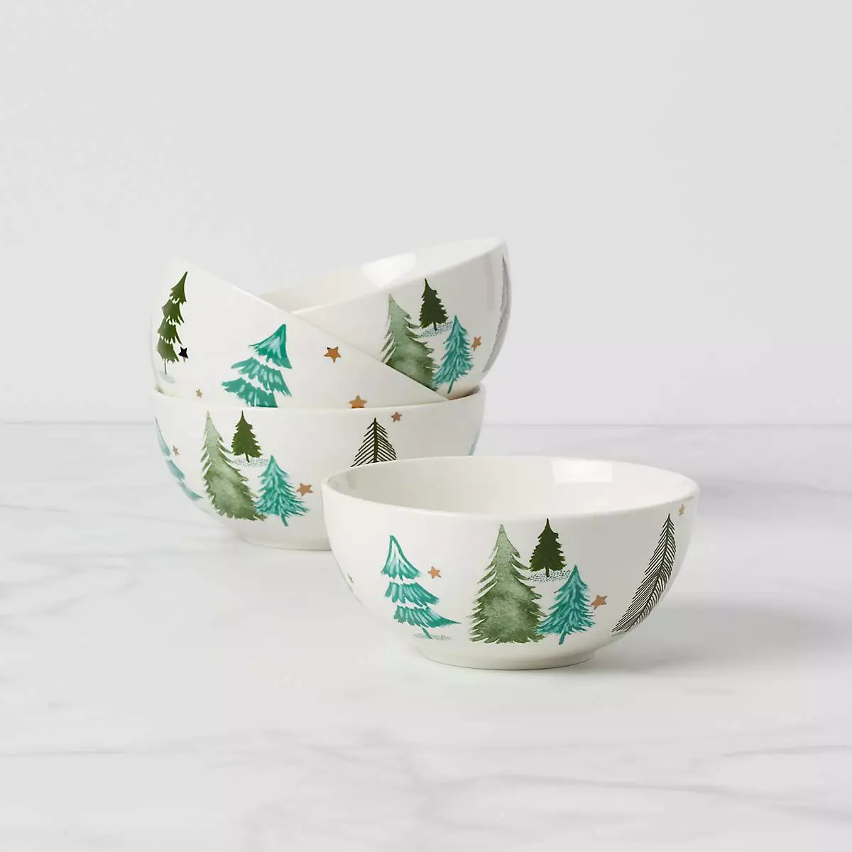 Four white ceramic bowls feature charming painted evergreens and glittering stars along the sides. Ideal for serving small meals, the bowls also make a touching holiday gift.