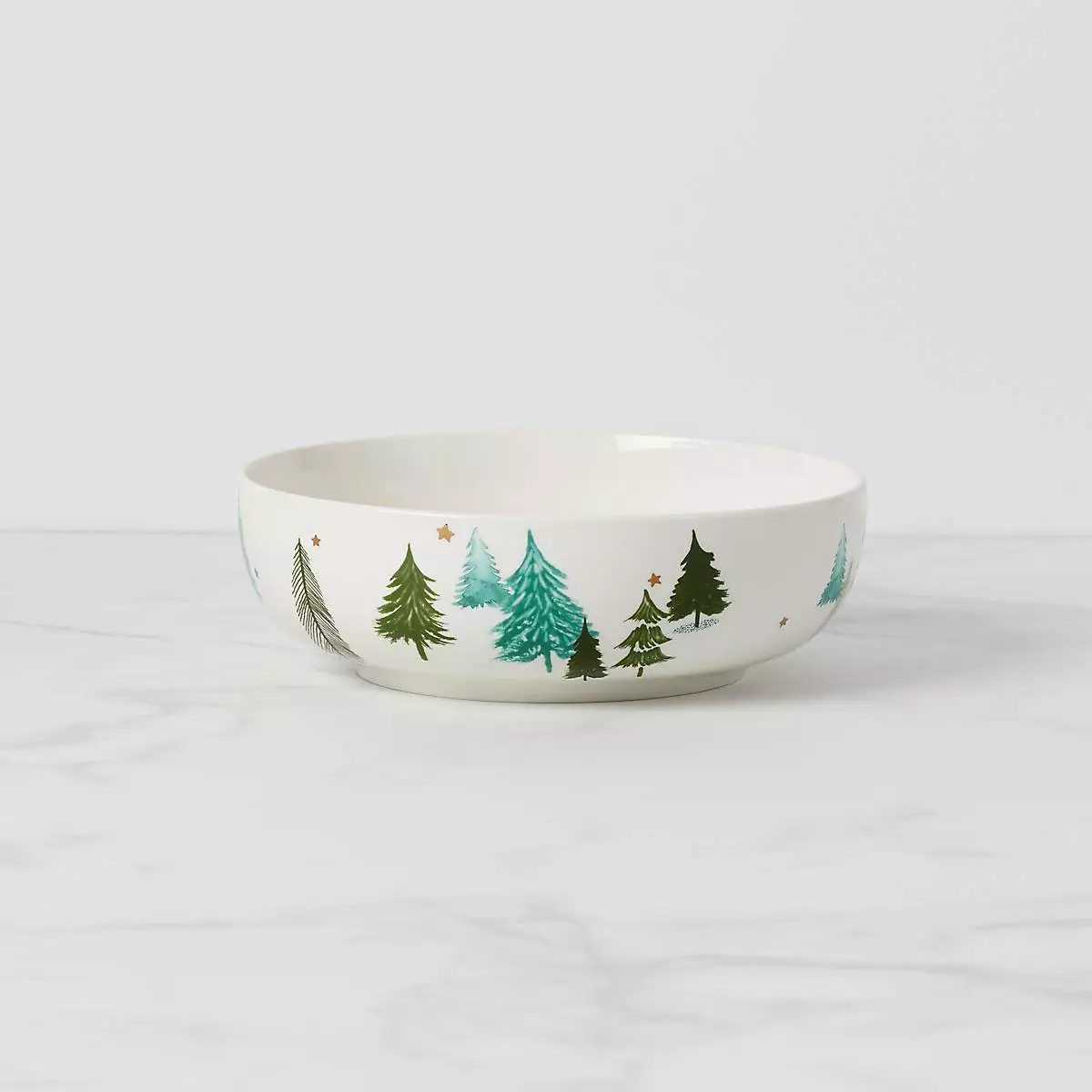 Crafted of porcelain, this serving bowl includes charming evergreen trees and painted metallic stars that shimmer in candlelight. The bowl is part of the Balsam Lane Collection.