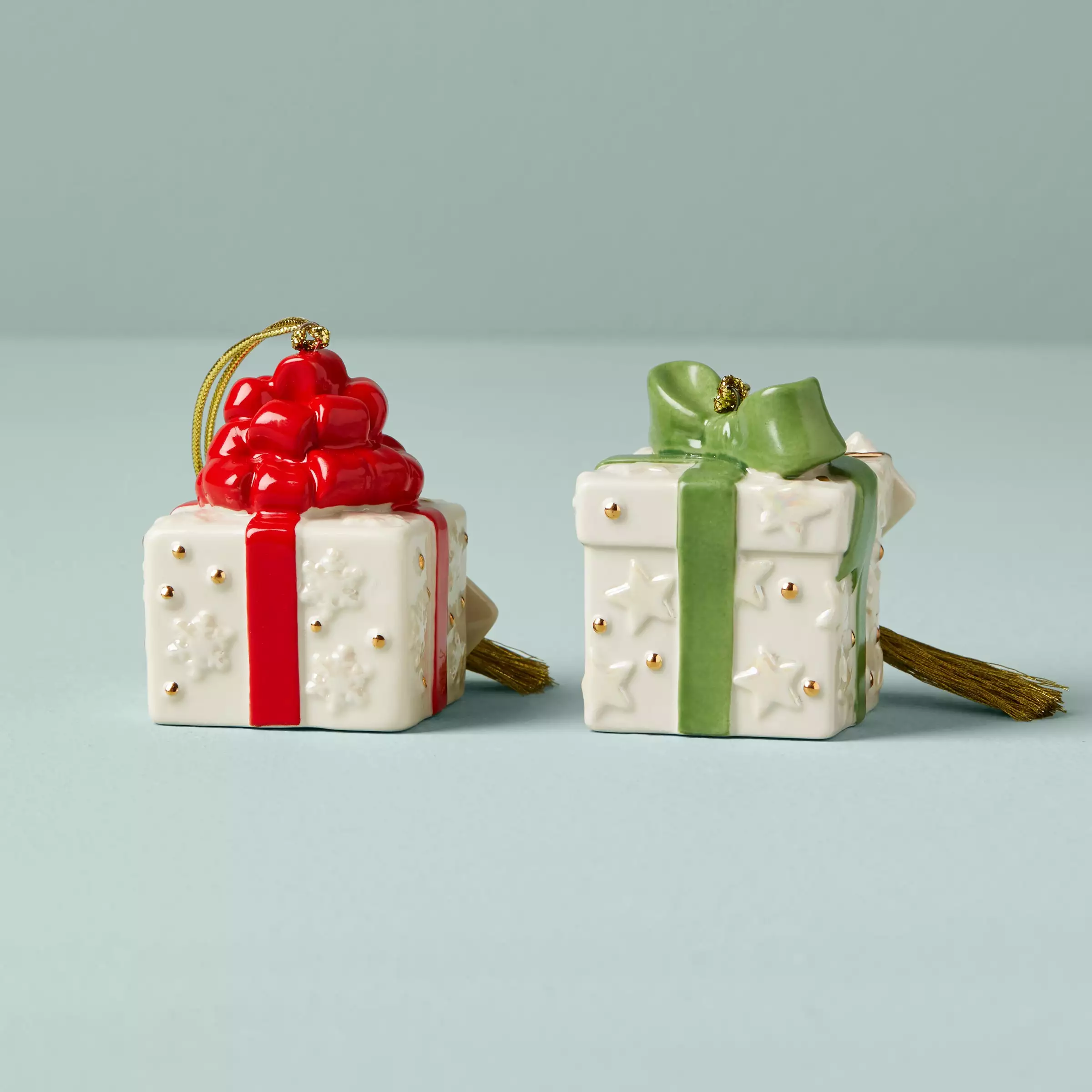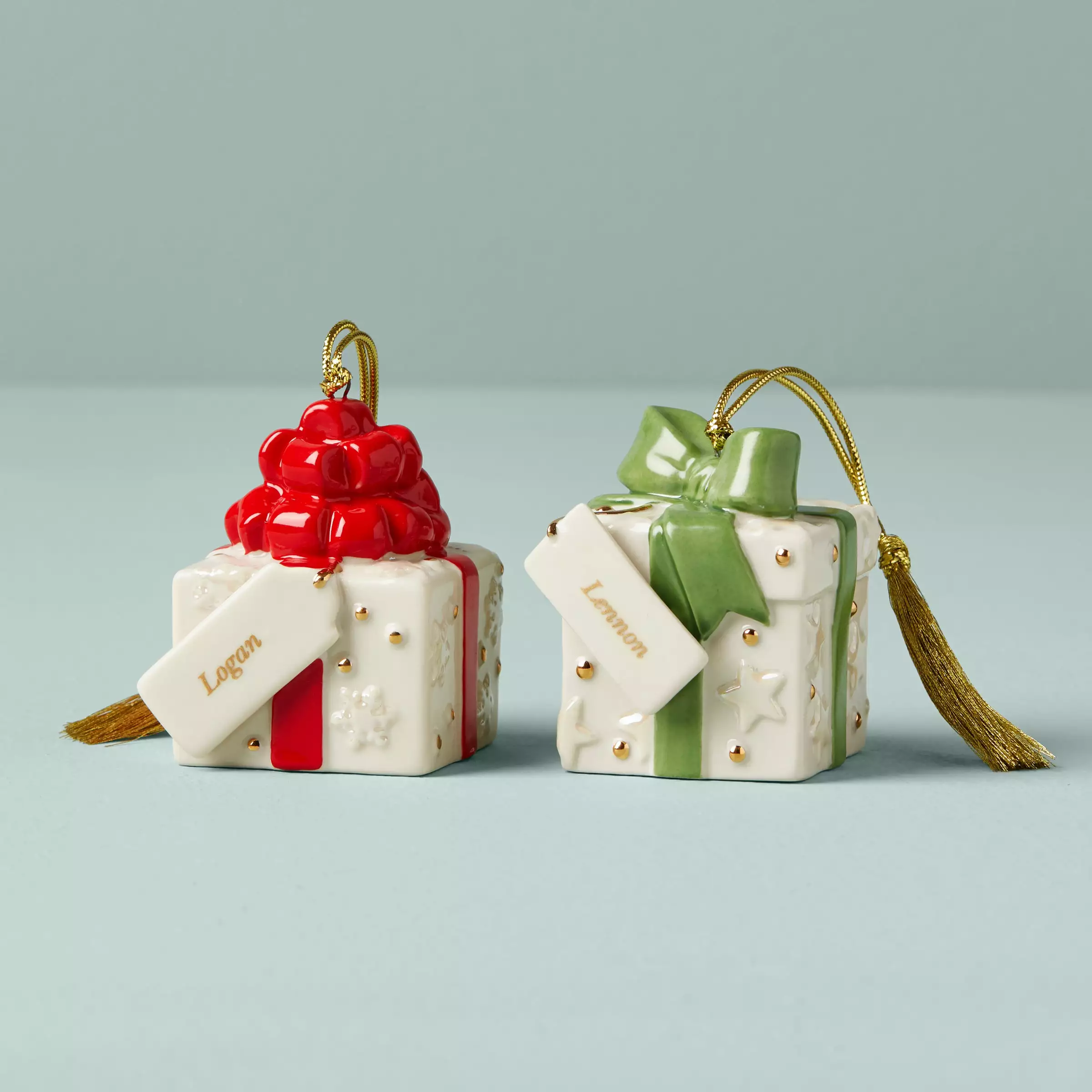Celebrate a lifelong friendship with this pair of personalized ornaments. Crafted from durable white ceramic porcelain, this ornament set is in the shape of gift boxes because friendship is the greatest gift of all.