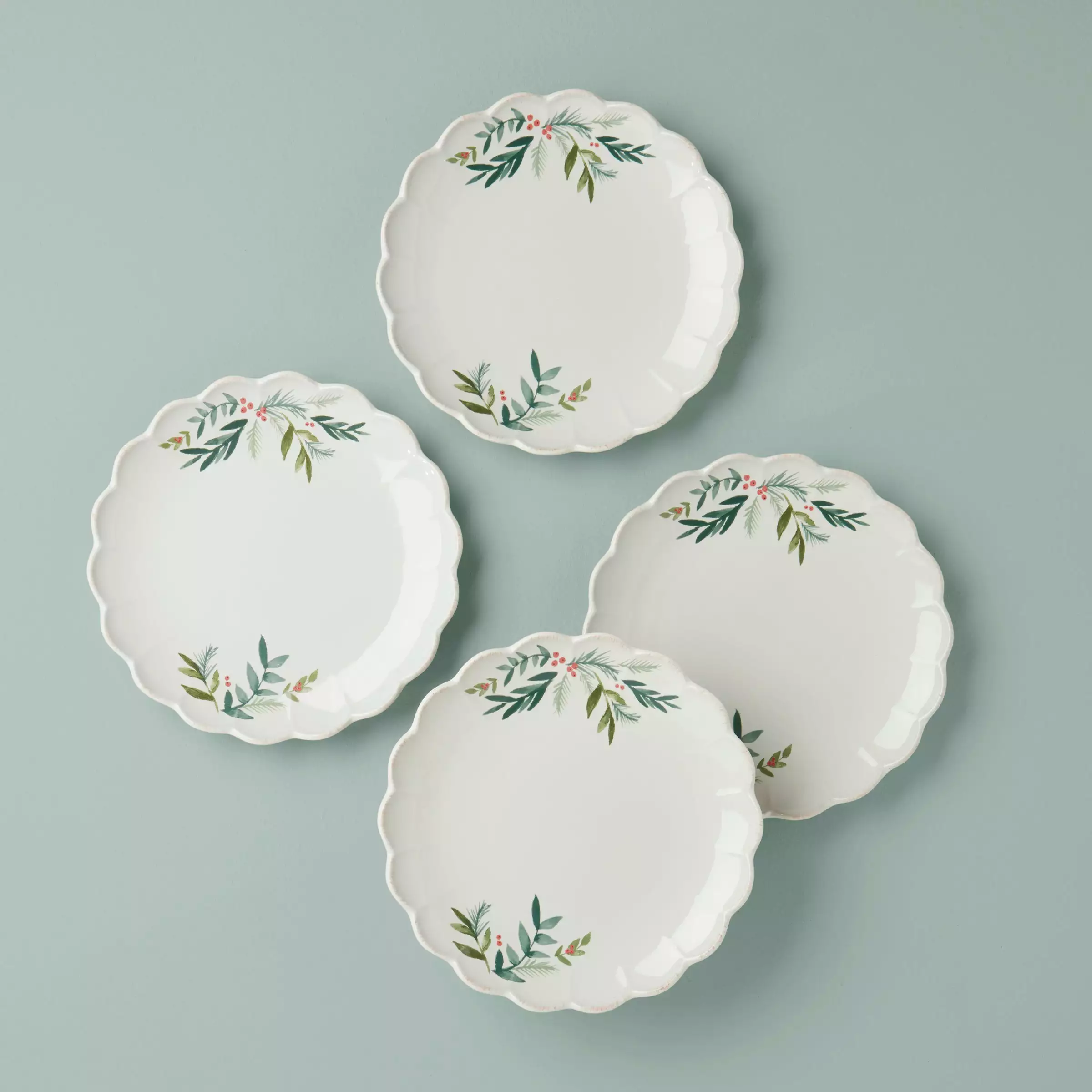 A festive fresh spin on the French Perle favorites. These accent plates feature artistic varieties of holiday holly with leaves, branches, and berries in a handpainted style. Crafted with smooth scallops on a snowy white base for a creative winter feel.