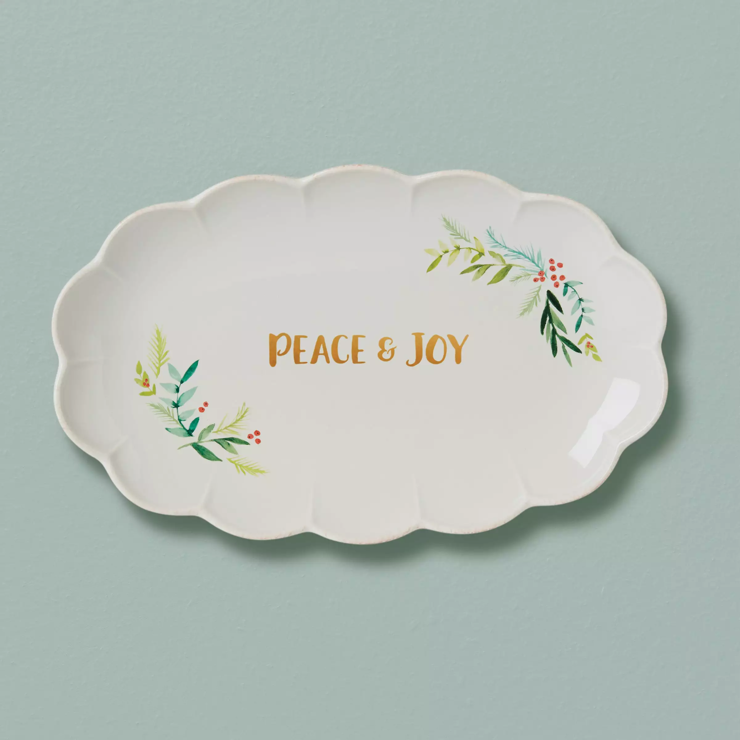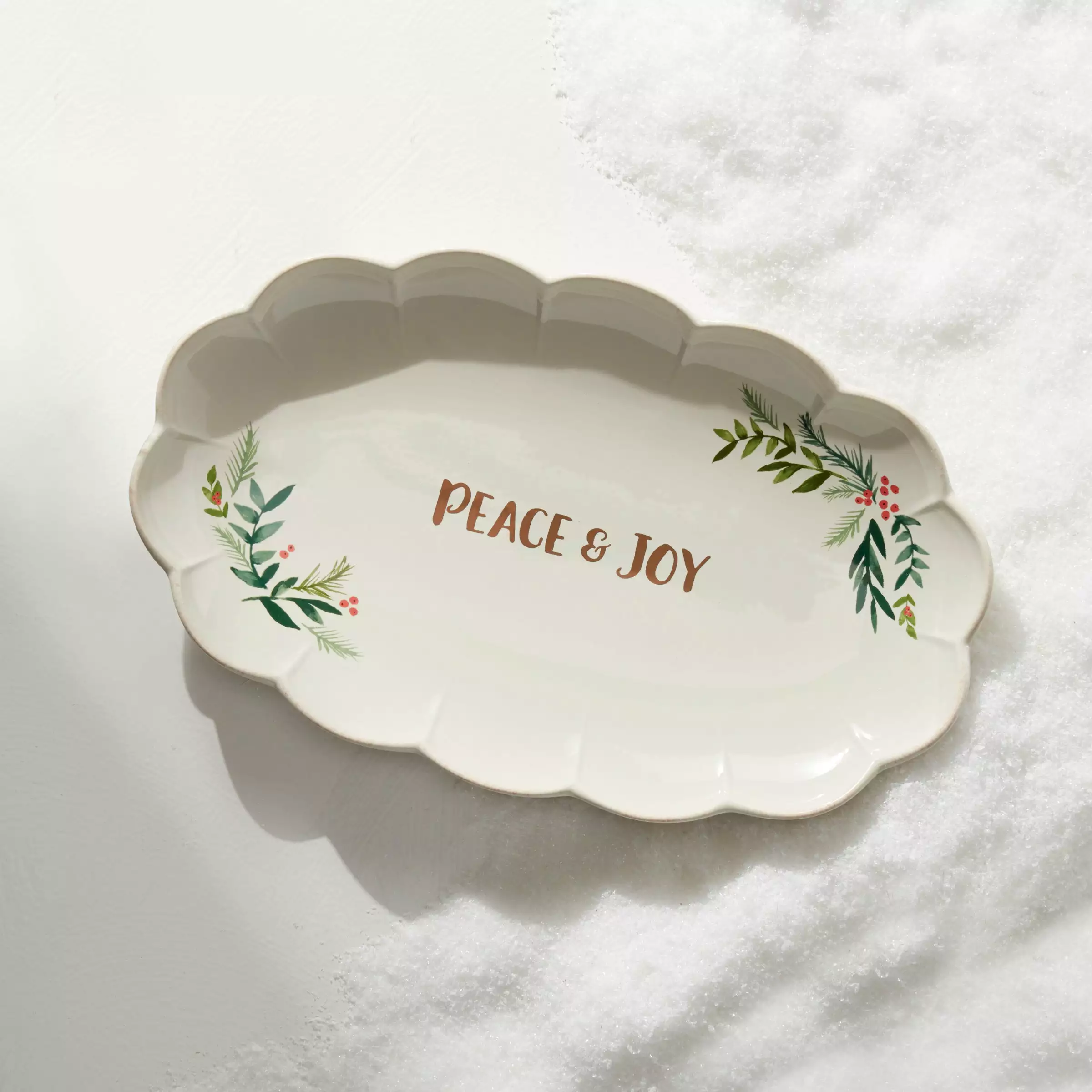 A festive fresh spin on the French Perle favorites. This platter features a wreath of artistic holiday holly with leaves, branches, and berries in a handpainted style around the words “Peace & Joy”. Crafted with smooth scallops on a snowy white base for a creative winter feel.