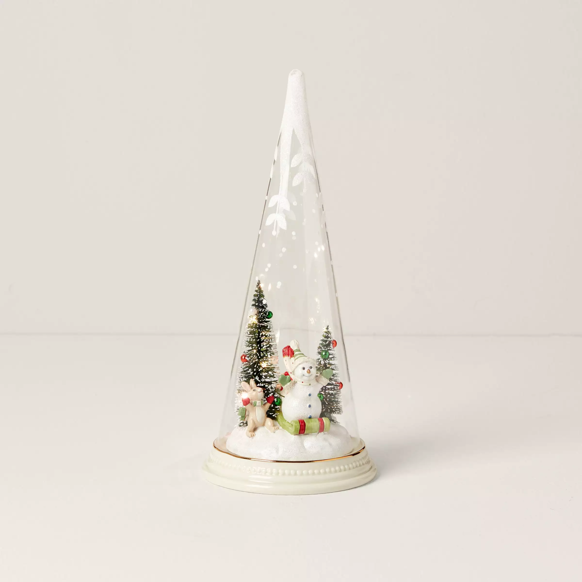 A charming winter scene unfolds with snowman sledding inside this light-up glass tree cone. It makes an elegant piece of Christmas decor and a treasured gift that no one will forget.