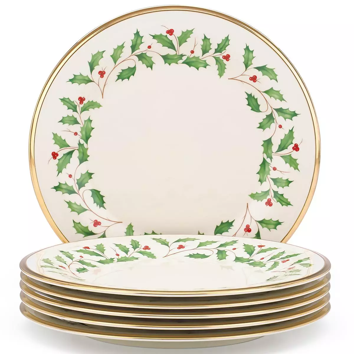 The Lenox Holiday dinnerware collection has been part of holiday celebrations for generations. This Holiday Dinner Plate Set will make a wonderful addition to your table every holiday season! It’s decorated with the cherished holly and berries Holiday motif and crafted of porcelain with a precious gold rim. The best part? Get six plates for the price of three!