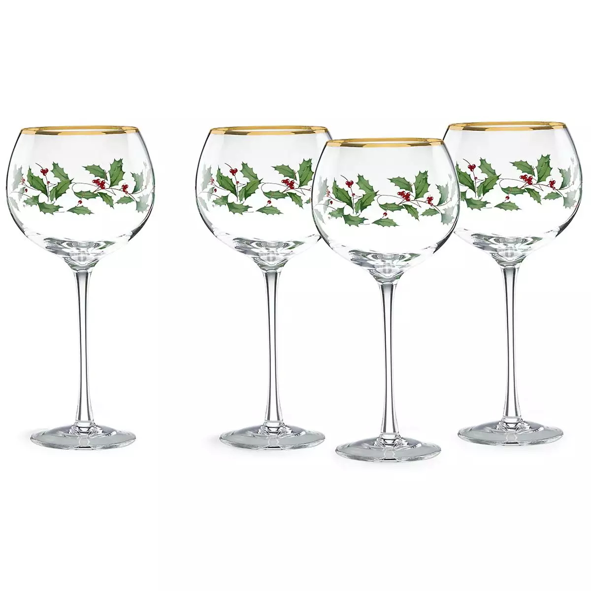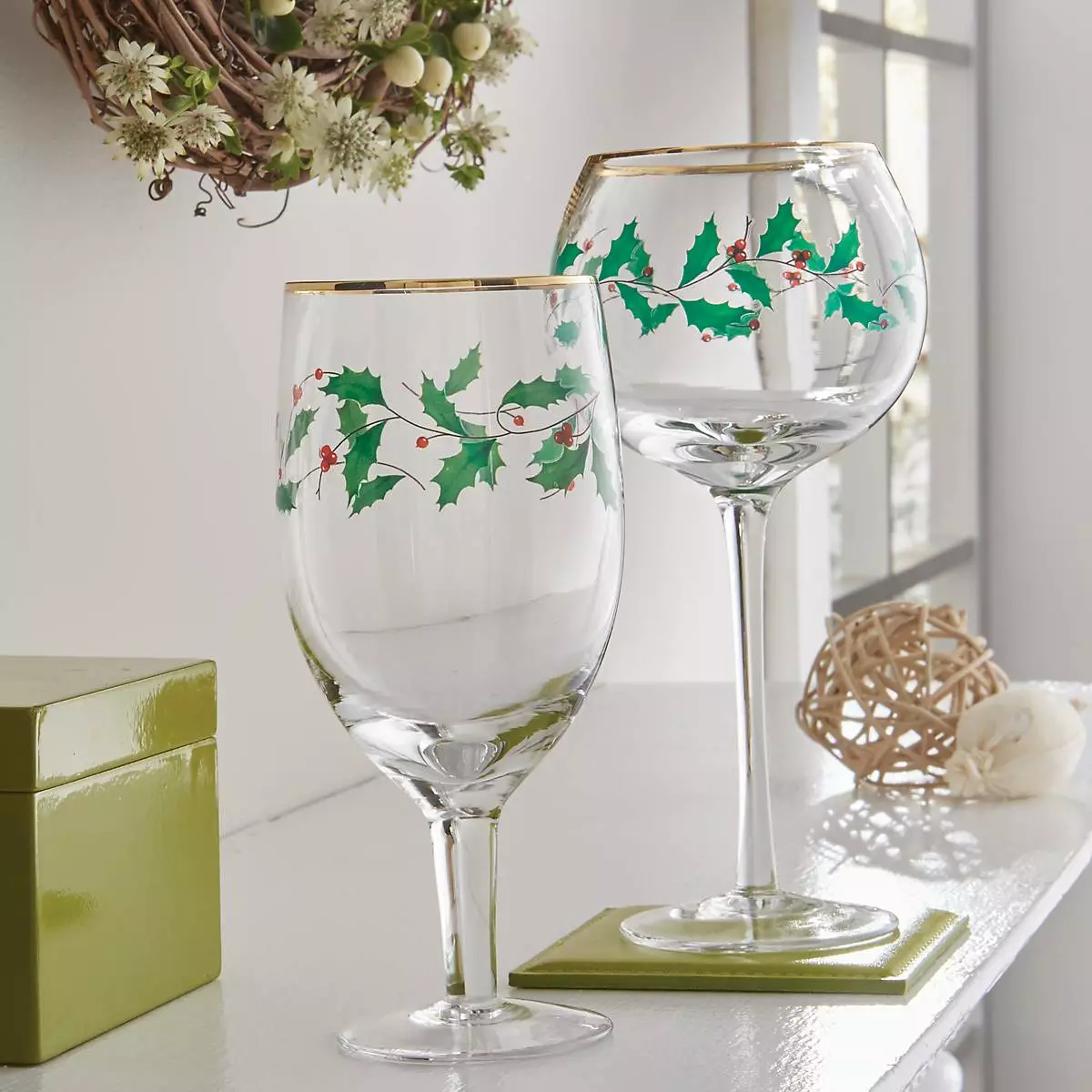 Enjoy a casual night in with family and friends or host a lavish upscale party with this 24k-gold-accented set of wine glasses. Featuring our best-selling Holiday pattern of holly leaves and berries, it’s bound to be a conversation starter for your Christmas dinner.