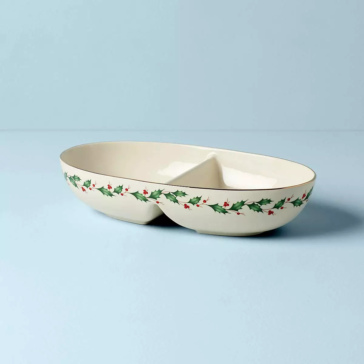 This two-part, divided ceramic serving bowl allows you to present two complementary dishes at once. The playful holly design and 24-karat gold accents will keep the table festive and vibrant.