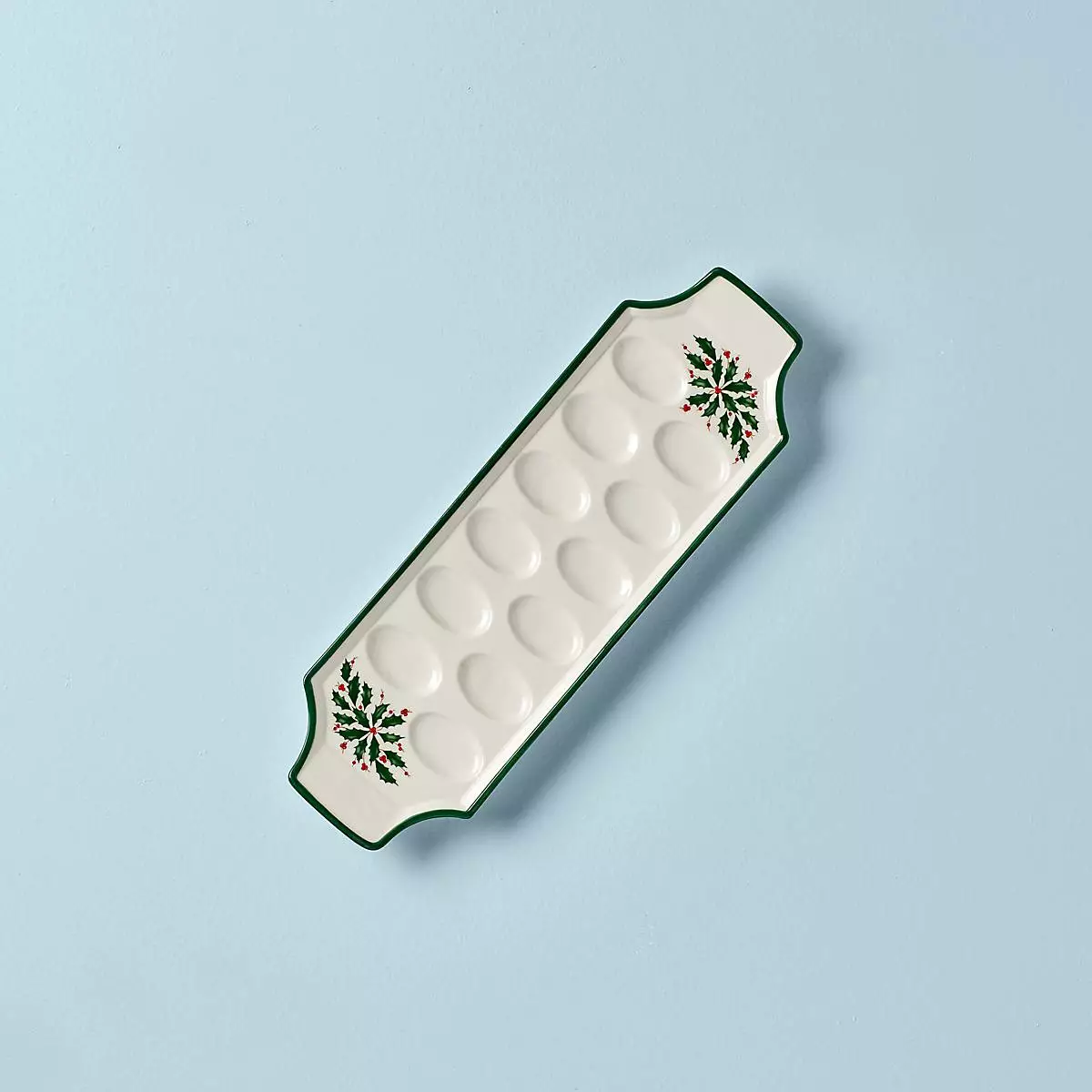 Serve a classic holiday appetizer with our Holiday deviled egg tray. Featuring details of our iconic Holiday pattern and trimmed in festive green, it makes a perfect addition to any table.