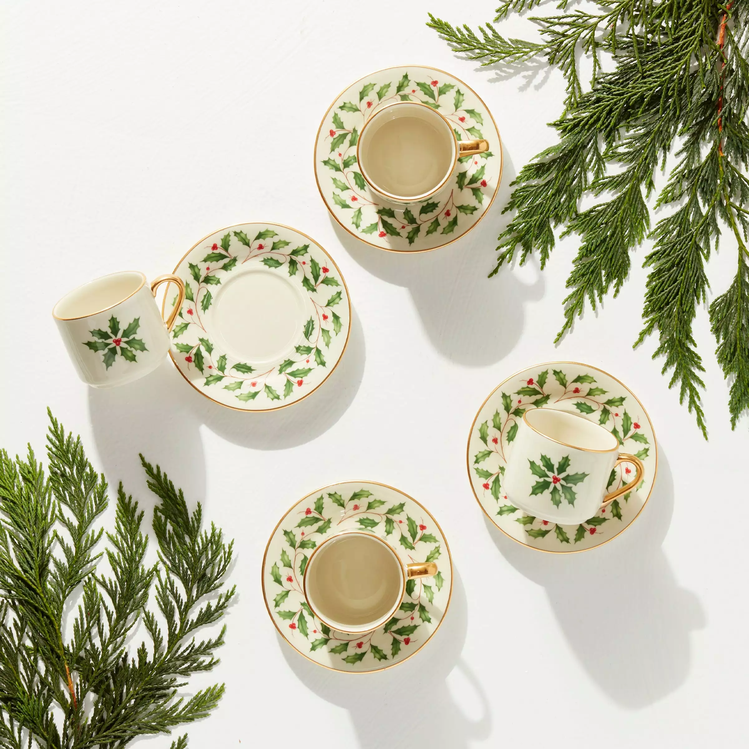 Savor the holidays with these espresso cups and saucers. Featuring holly leaf motifs crafted with seasonal spirit on a snowy white base.