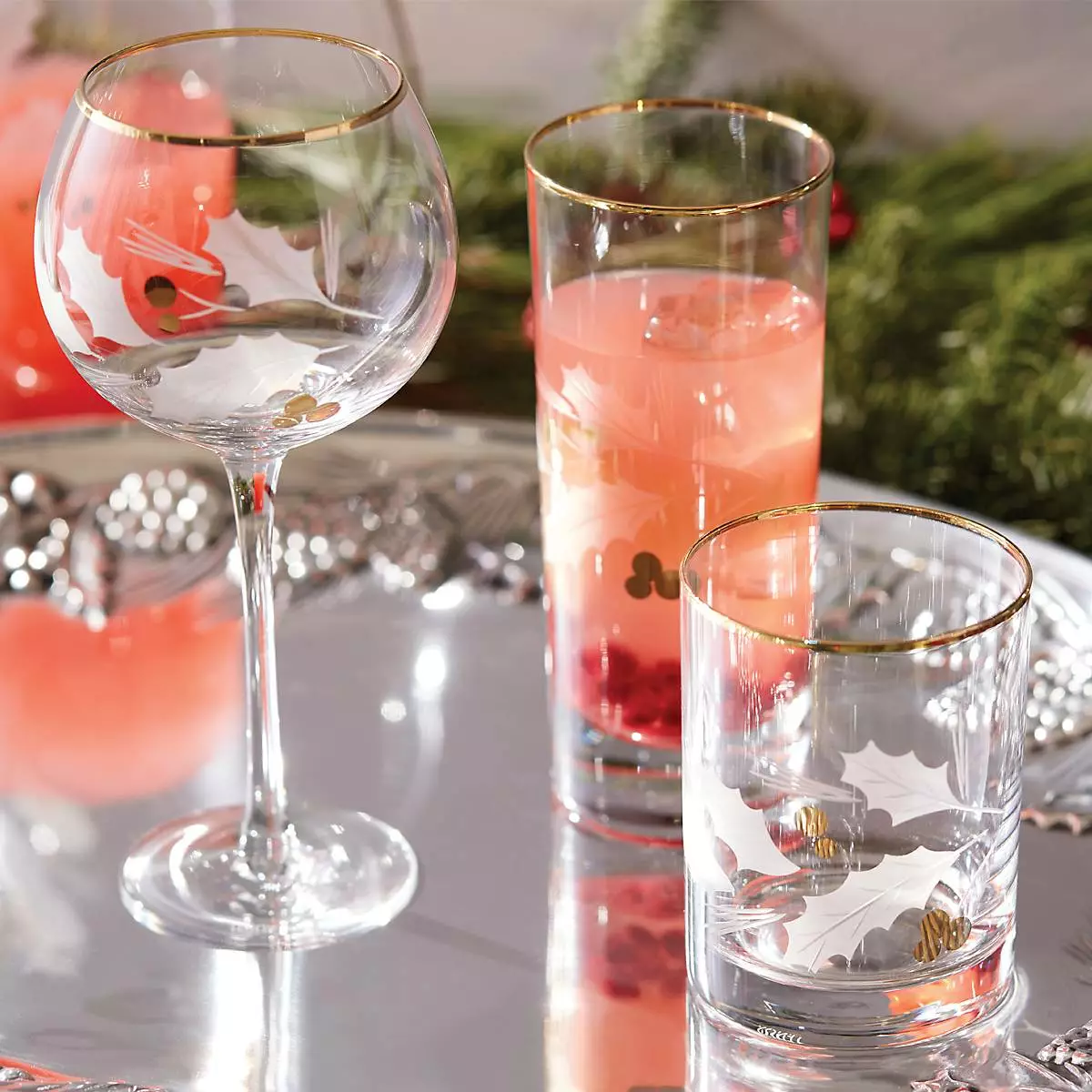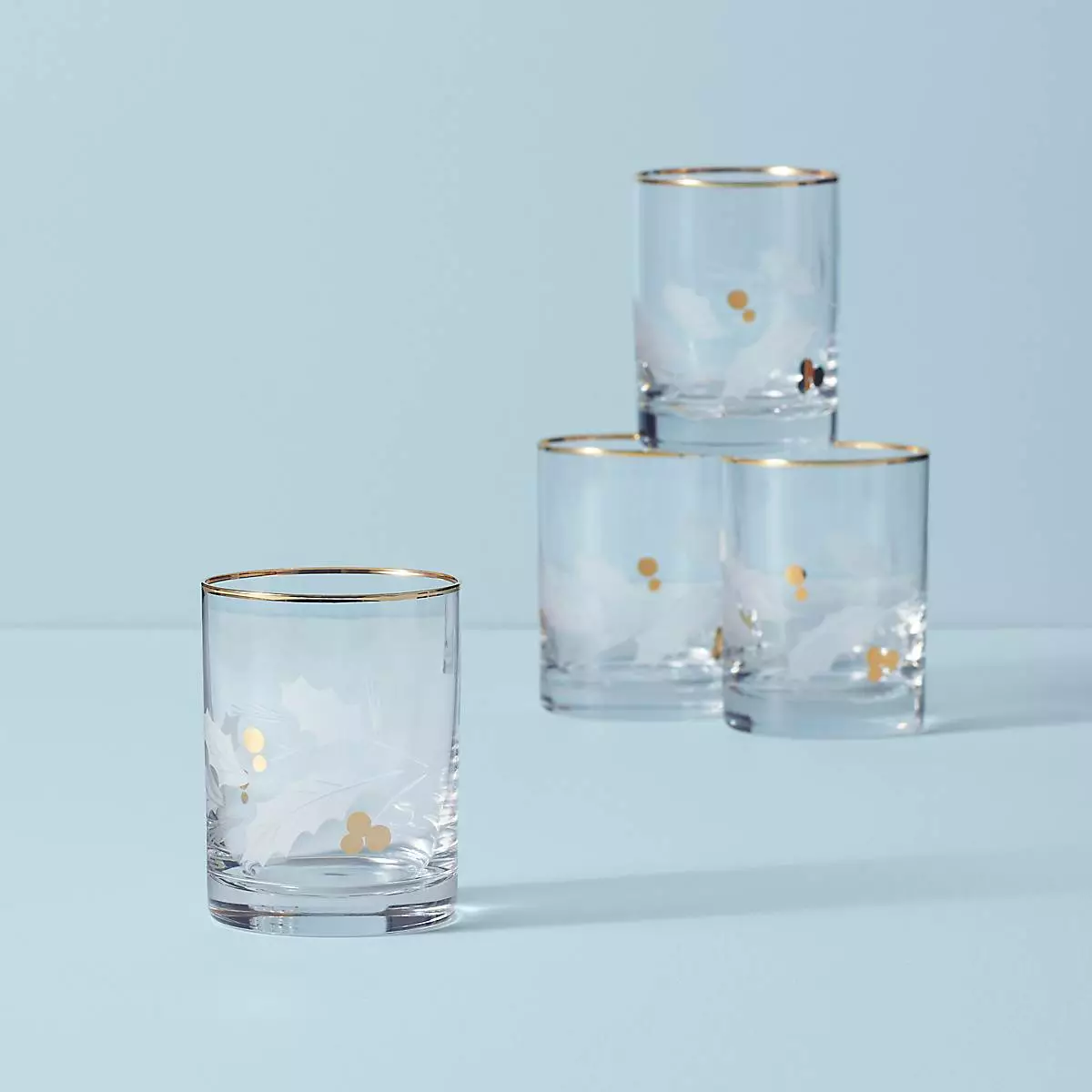Etched holly leaves with golden berries form an elegant holiday pattern on this 4-piece double old fashioned glass set. A delicate gold finish creates a polished design around the rim.