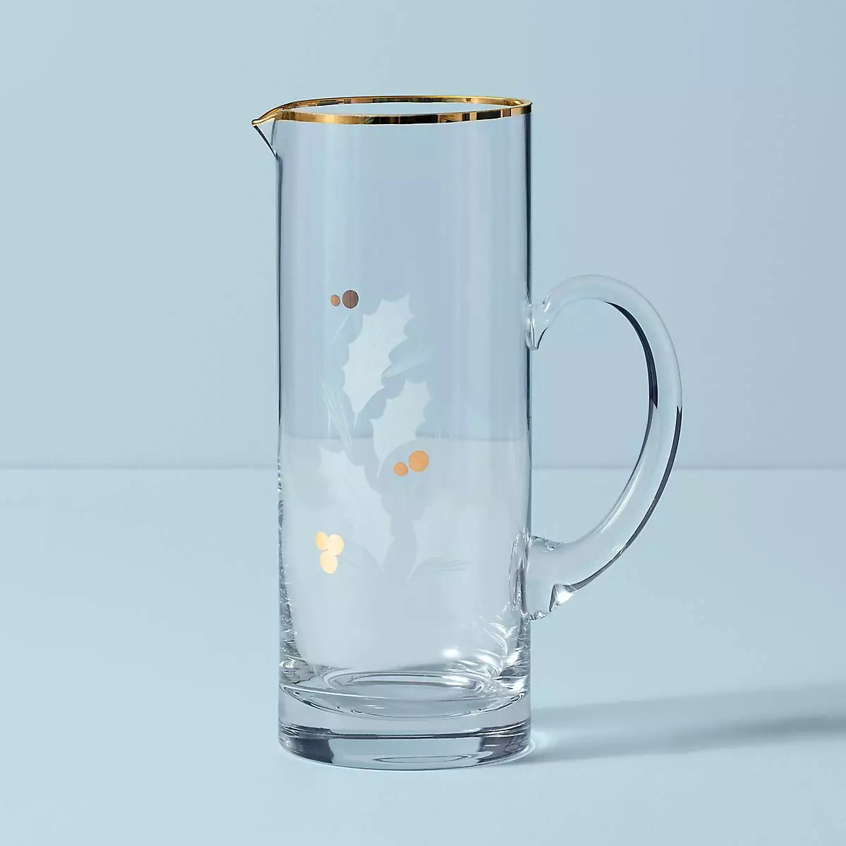 Etched holly leaves with golden berries form an elegant holiday pattern on this glass pitcher. A delicate gold finish creates a polished design around the rim.