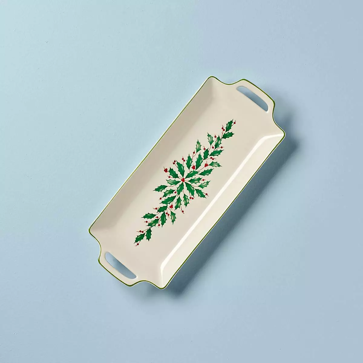 This ivory porcelain hors d’oeuvre tray features Lenox’s iconic holly and berry motif at the center. We added a festive green trim along the edge for an extra special touch. It’s perfect for serving appetizers during your next holiday get-together!