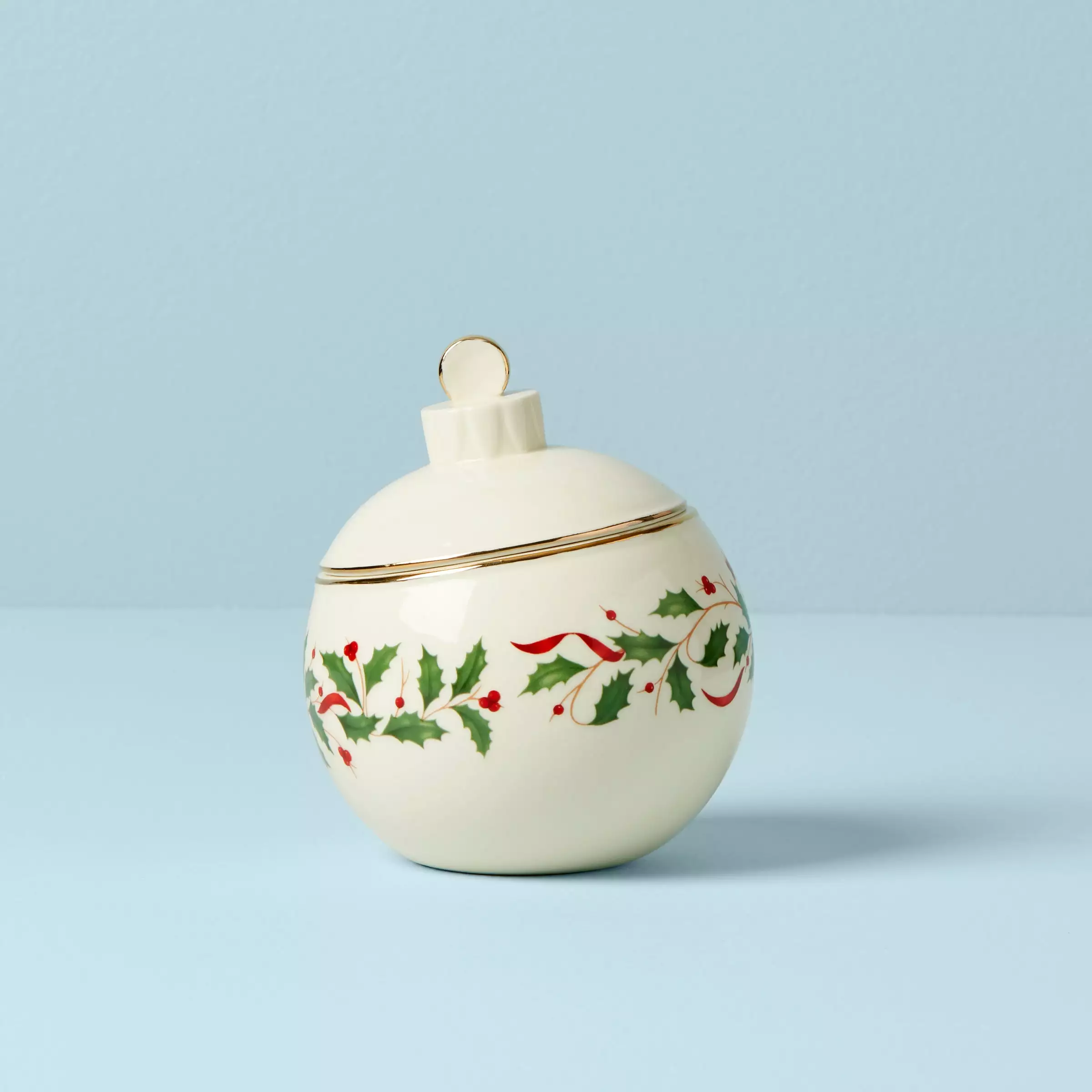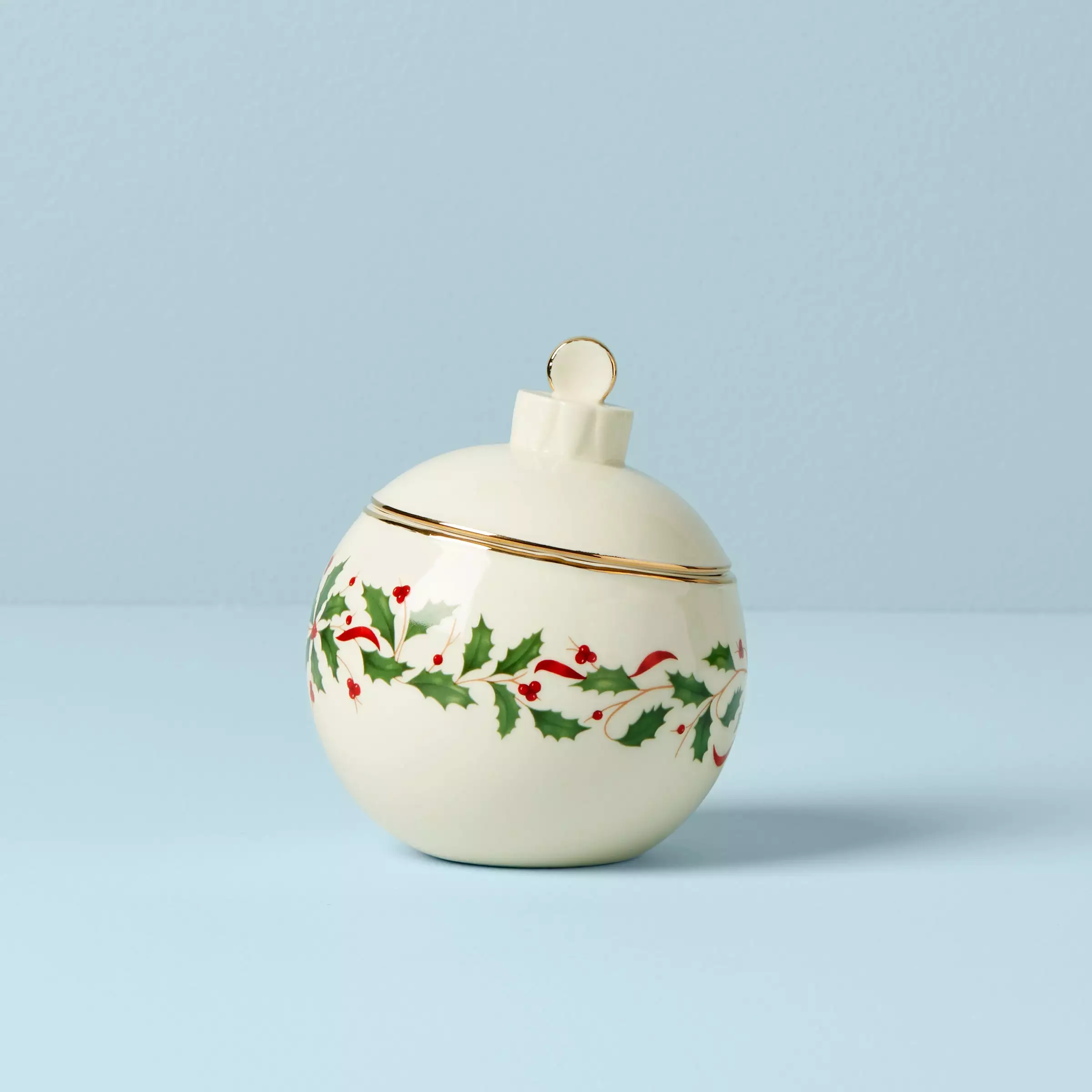 New from our bestselling Holiday collection, this sweet candy jar comes in the shape of an ornament and features our signature holly motif. Accented in 24k gold, this precious treat jar is perfect for serving after-dinner mints and candy to your guests!