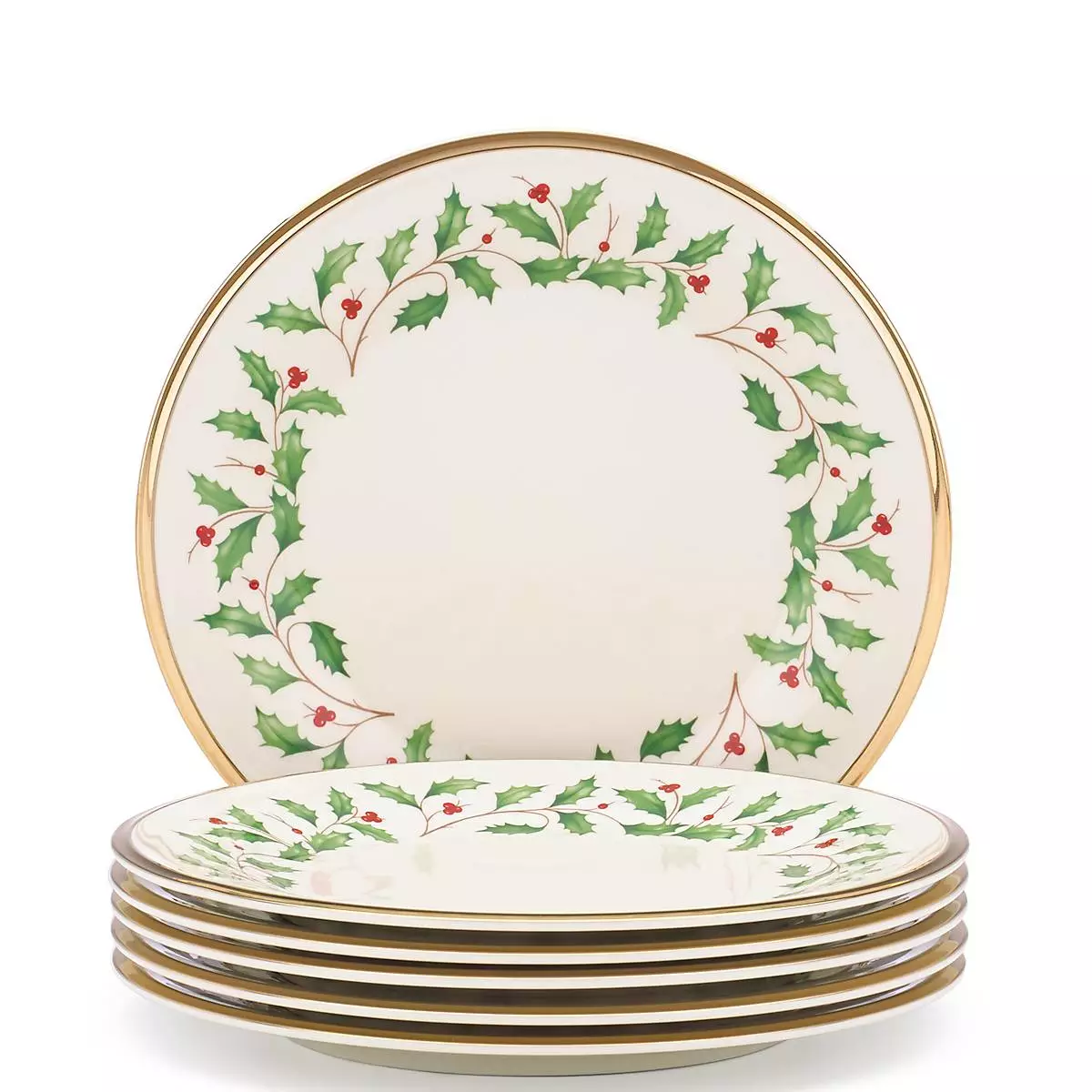 Colorful holly encircled with gold. This Holiday Salad Plate Set will make a wonderful addition to your table every holiday season! It’s decorated with the cherished holly and berries Holiday motif and crafted of porcelain with a precious gold rim. The best part? Get six plates for the price of three!