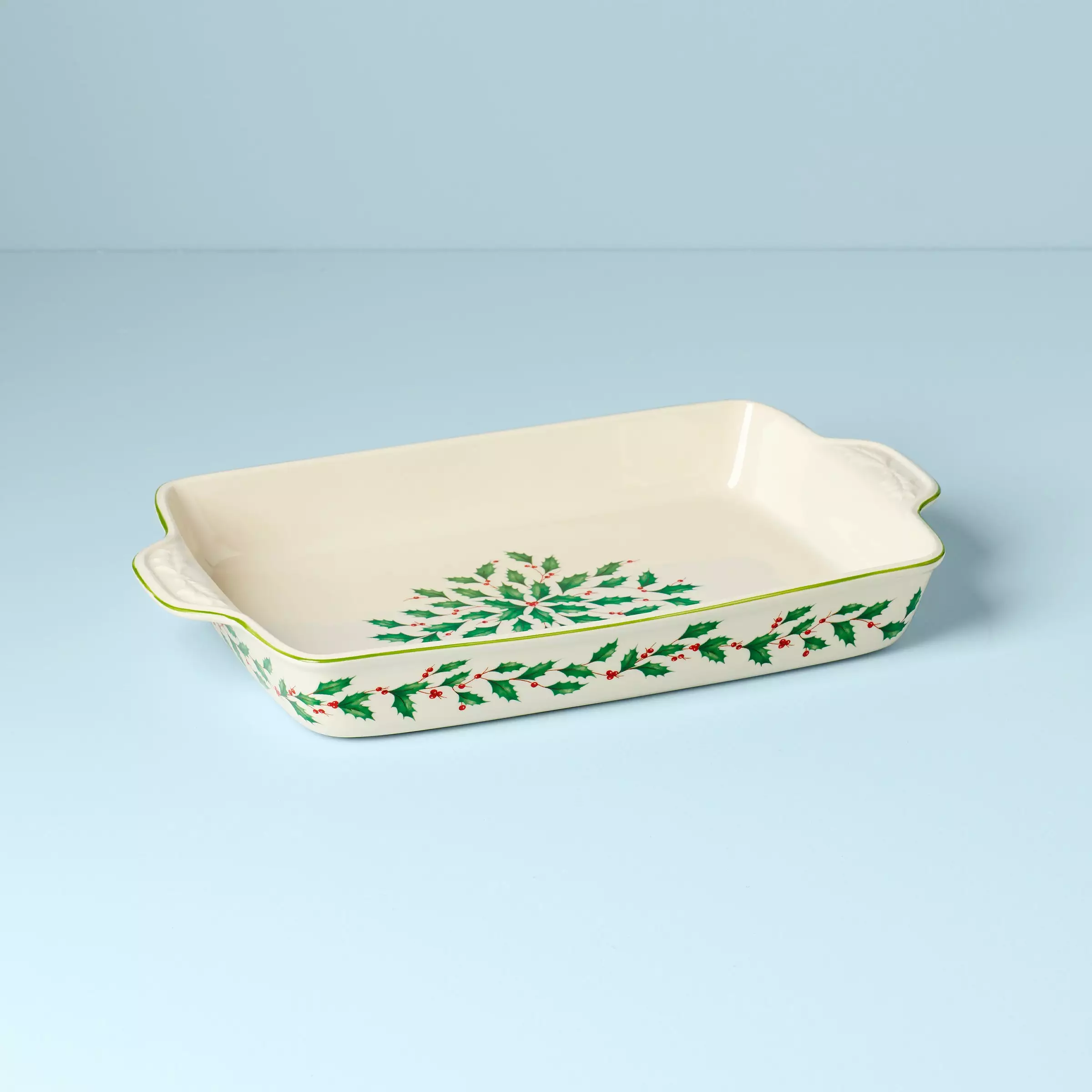 The Holiday Rectangular Baker allows for dishes to be prepared and served in the same platter, making holiday hosting a breeze. This ceramic dish features a holly motif and is ideal for casseroles.