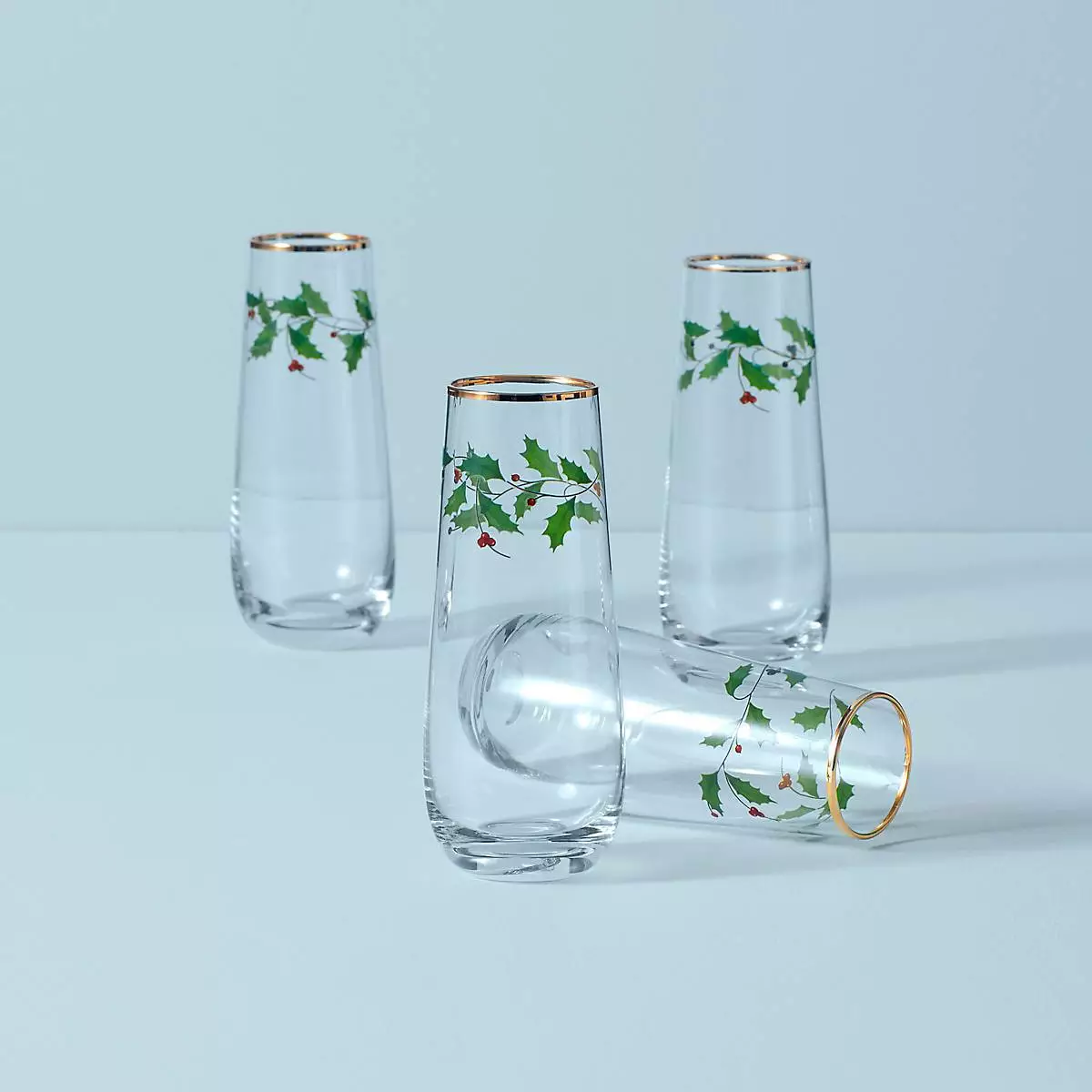 Start the holiday right with these Holiday™ stemless flutes. Featuring the iconic Holiday™ pattern, these gold-rimmed flutes are perfect for toasting the season.