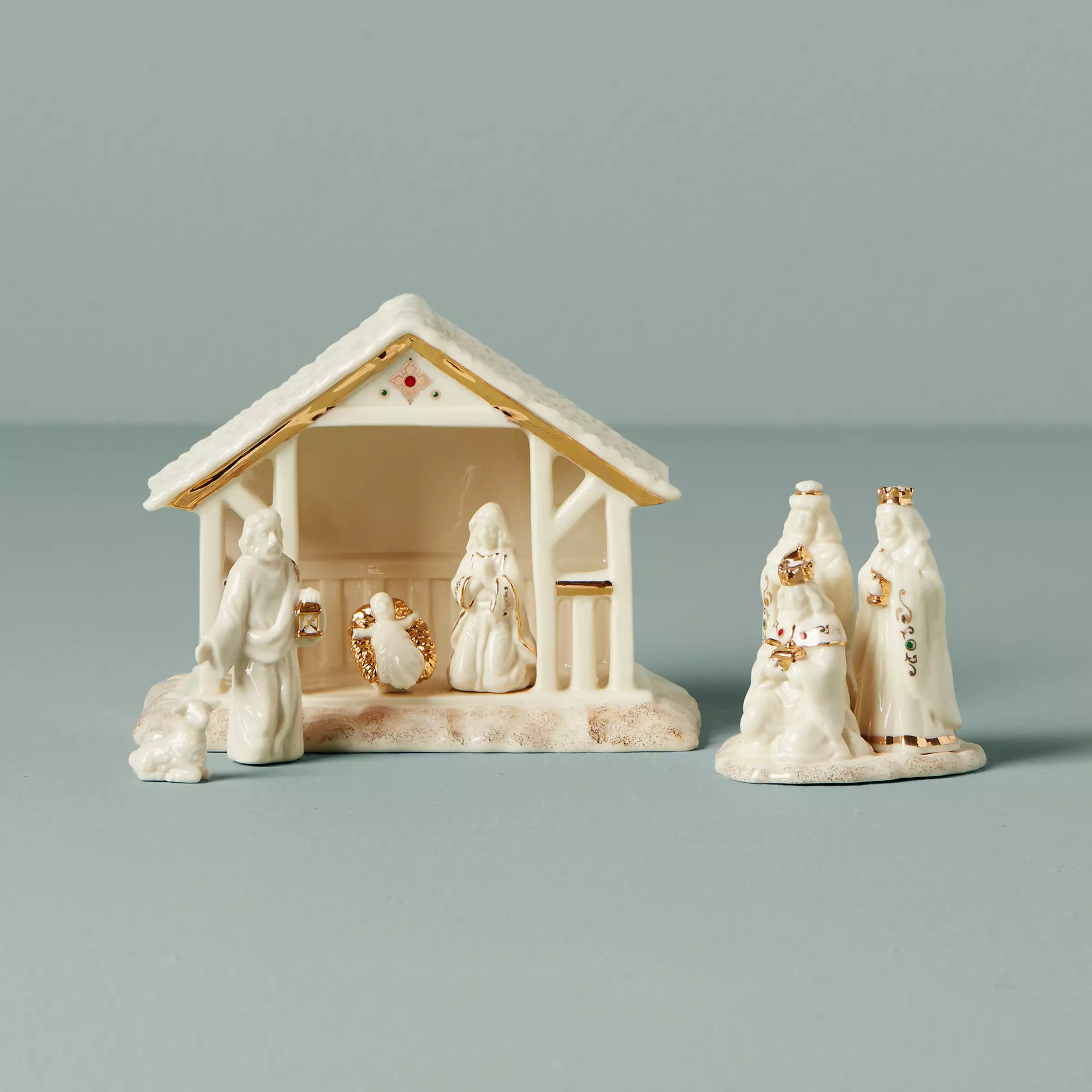 Part of our Mistletoe Park Village Traditions collection, this manger set is beautiful recreation of the nativity. Each piece is crafted of creamy porcelain with 24k gold accents. This 6-piece set comes with three figurines for the Holy Family, one Three Kings figurine, one lamb and one crèche.
