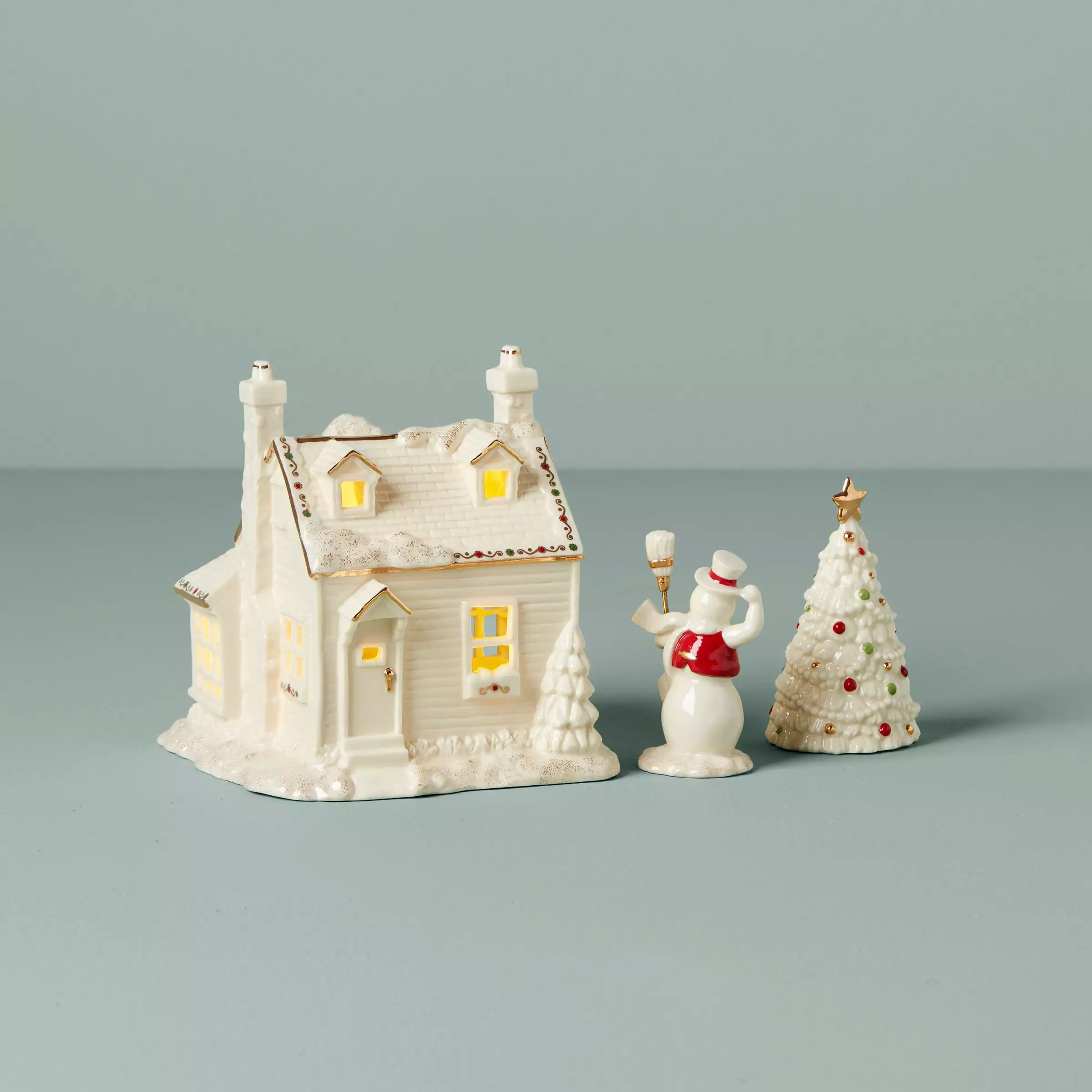 Create a cozy winter scene with our Mistletoe Park Village Traditions collection. This 3-piece figurine set features a Christmas tree, snowman and a light-up cottage all crafted of creamy porcelain and complete with 24k gold accents for a beautiful finish. It’s the perfect starter set to add merriment to your home!