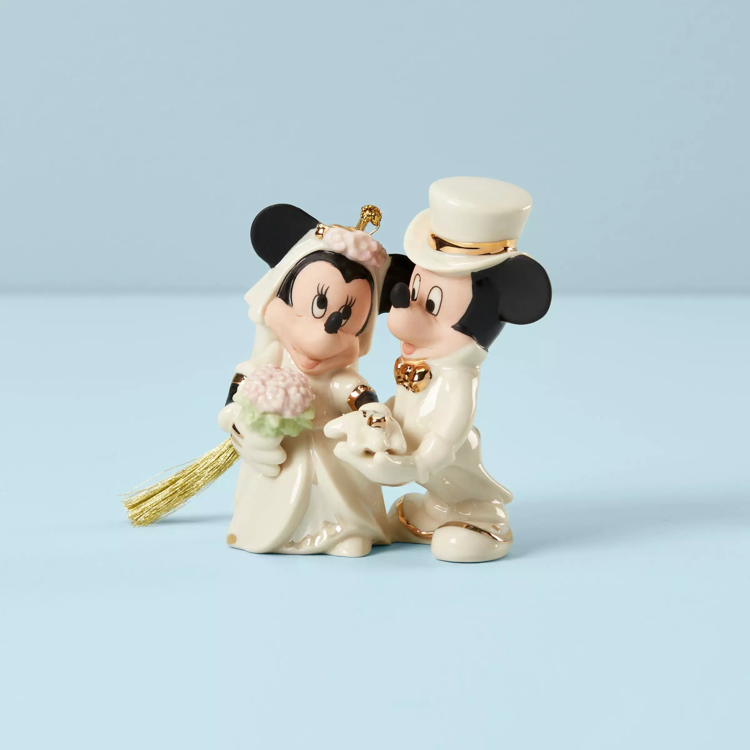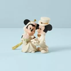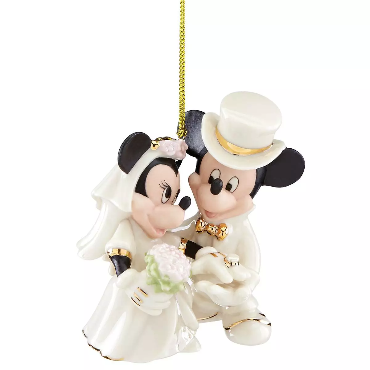Adorned in matching white formal wear complete with 24-karat golden accents, this Mickey and Minnie Mouse wedding ornament is elegant and heartfelt and makes a thoughtful gift.
