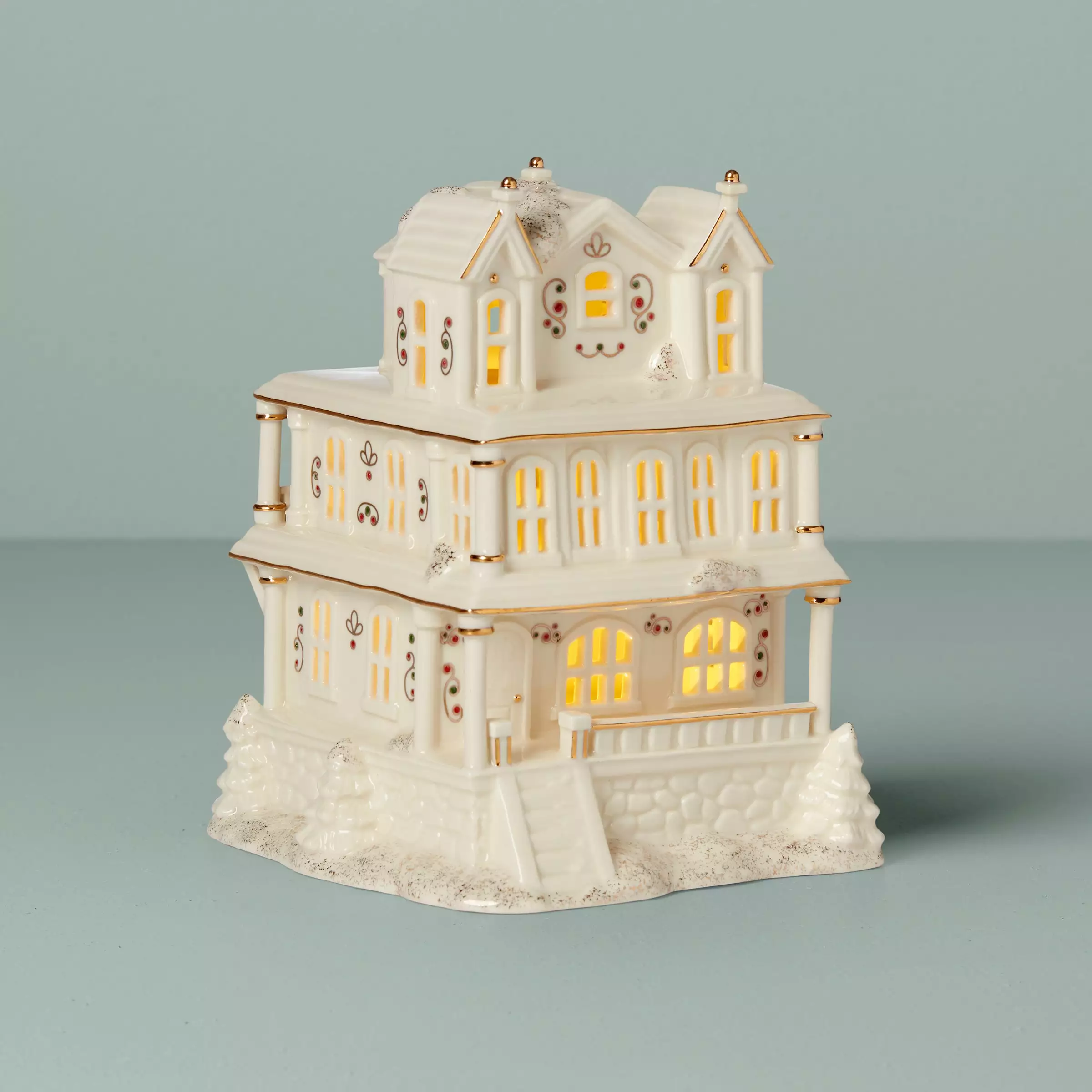 Create a cozy winter scene with our Mistletoe Park Village Traditions collection. This light-up Victorian house figurine is crafted in creamy porcelain and is softly illuminated from the inside to create a warm, glowing atmosphere. Complete with 24k gold accents for a beautiful finish.