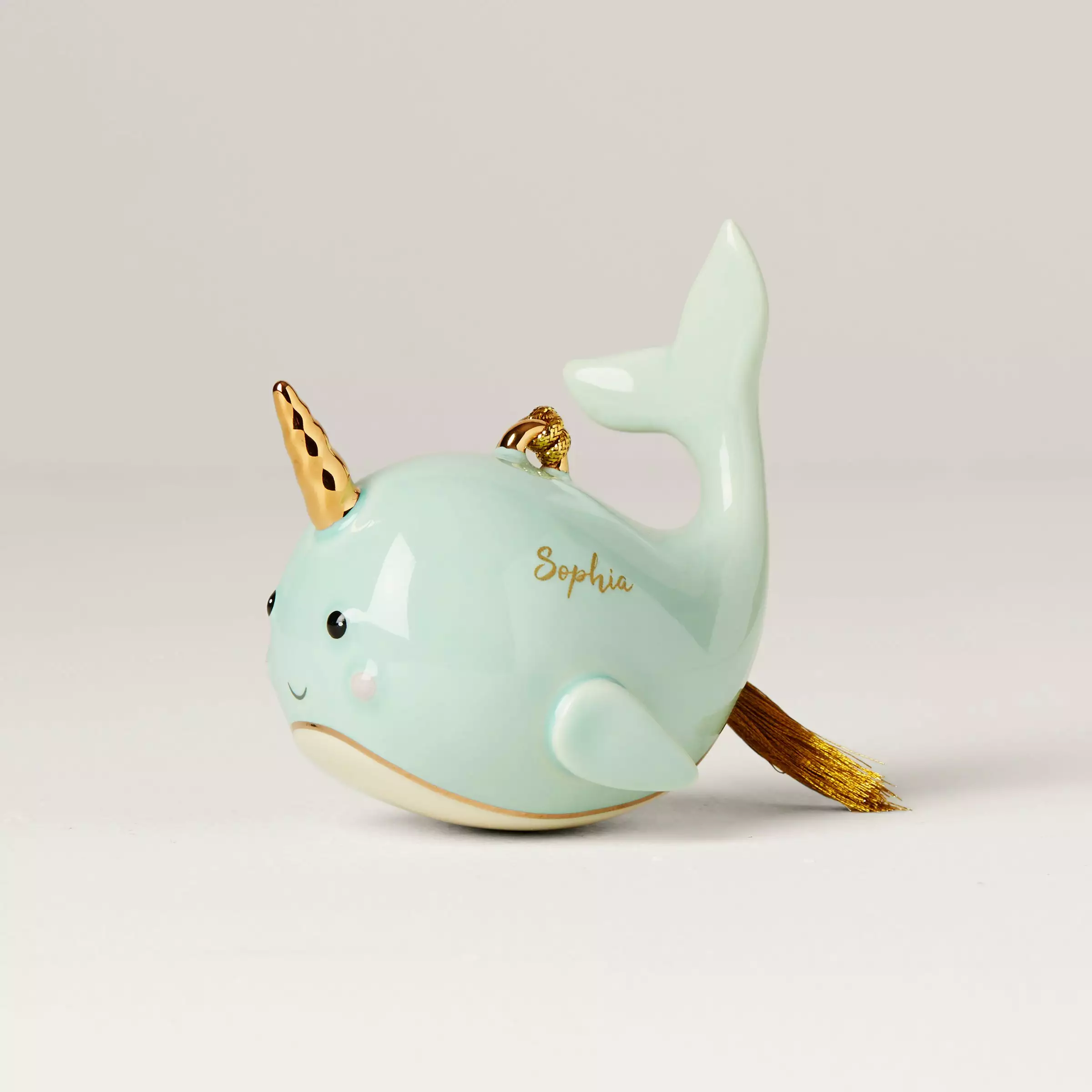 This adorable narwhal ornament is the cutest addition to your tree. This sweetly-smiling narwhal features hand-painted details, 24-karat gold accents and a space for personalizing with any name. Makes a wonderful gift for all!