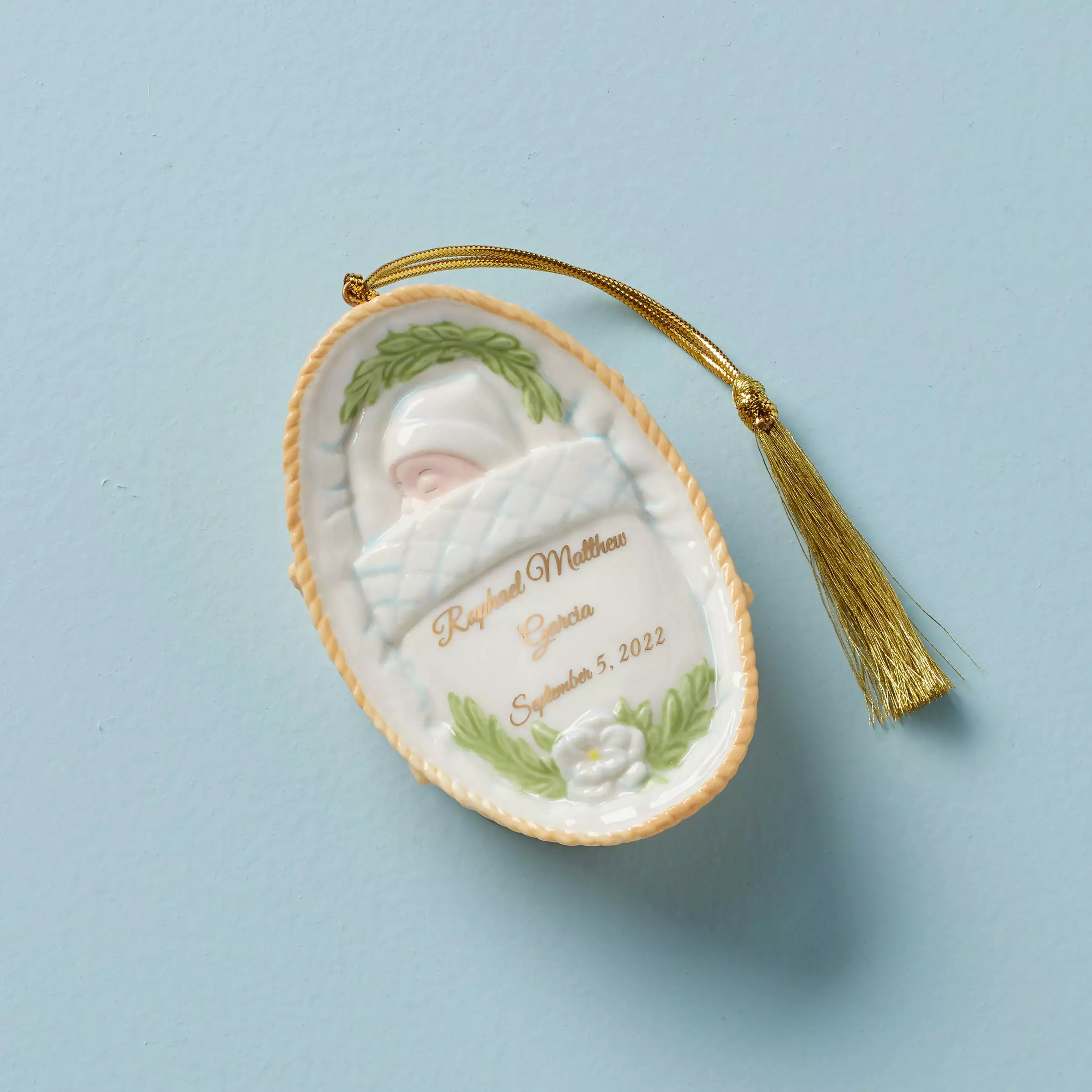 Celebrate your new bundle of joy with this adorable ornament. Featuring hand-painted details, this ornament can be personalized with name and date for an extra special gift. Makes a wonderful addition to any tree.