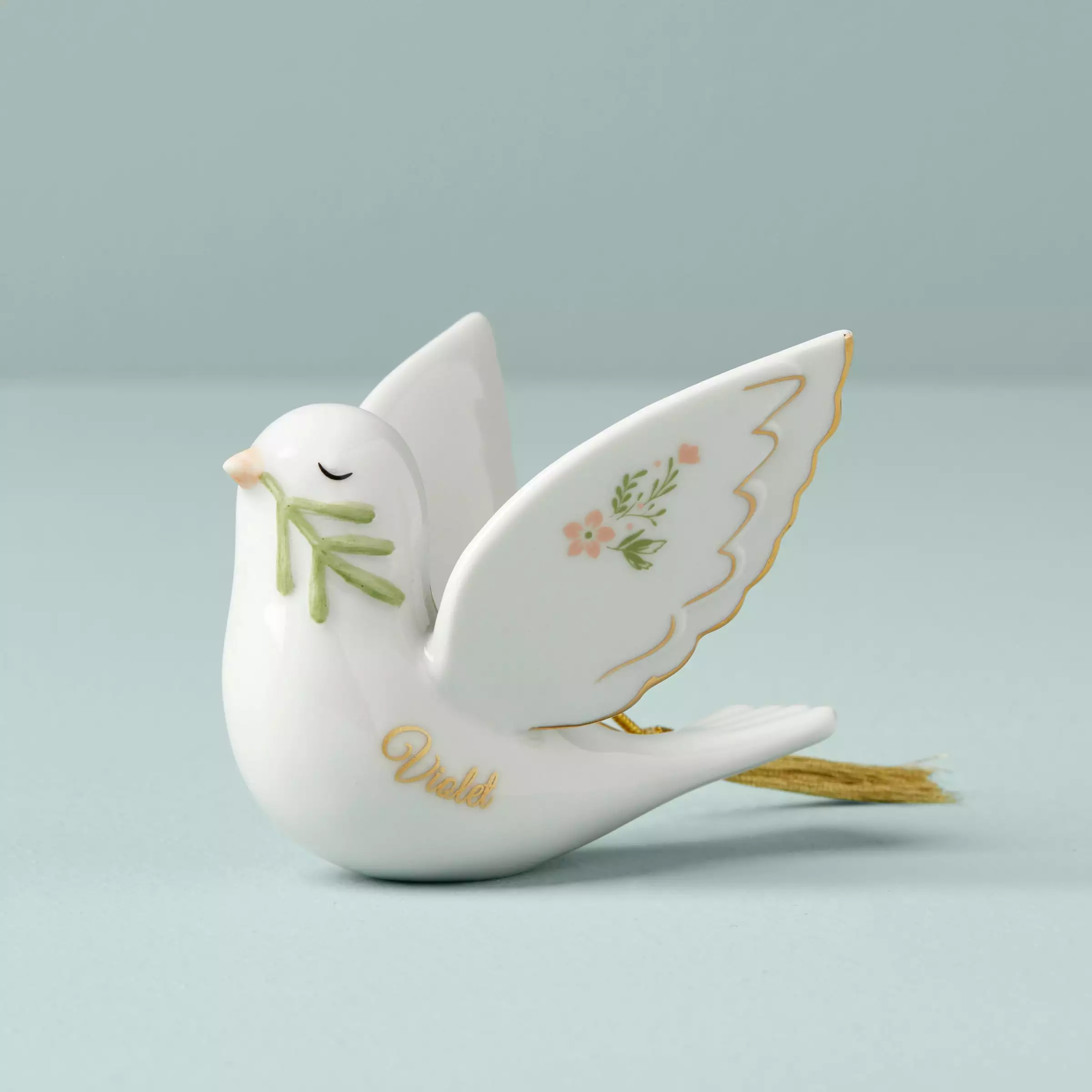 This sweet dove ornament features pretty floral details and includes a spot for personalization. Add any name to give an extra special gift! Makes a wonderful addition to your tree.