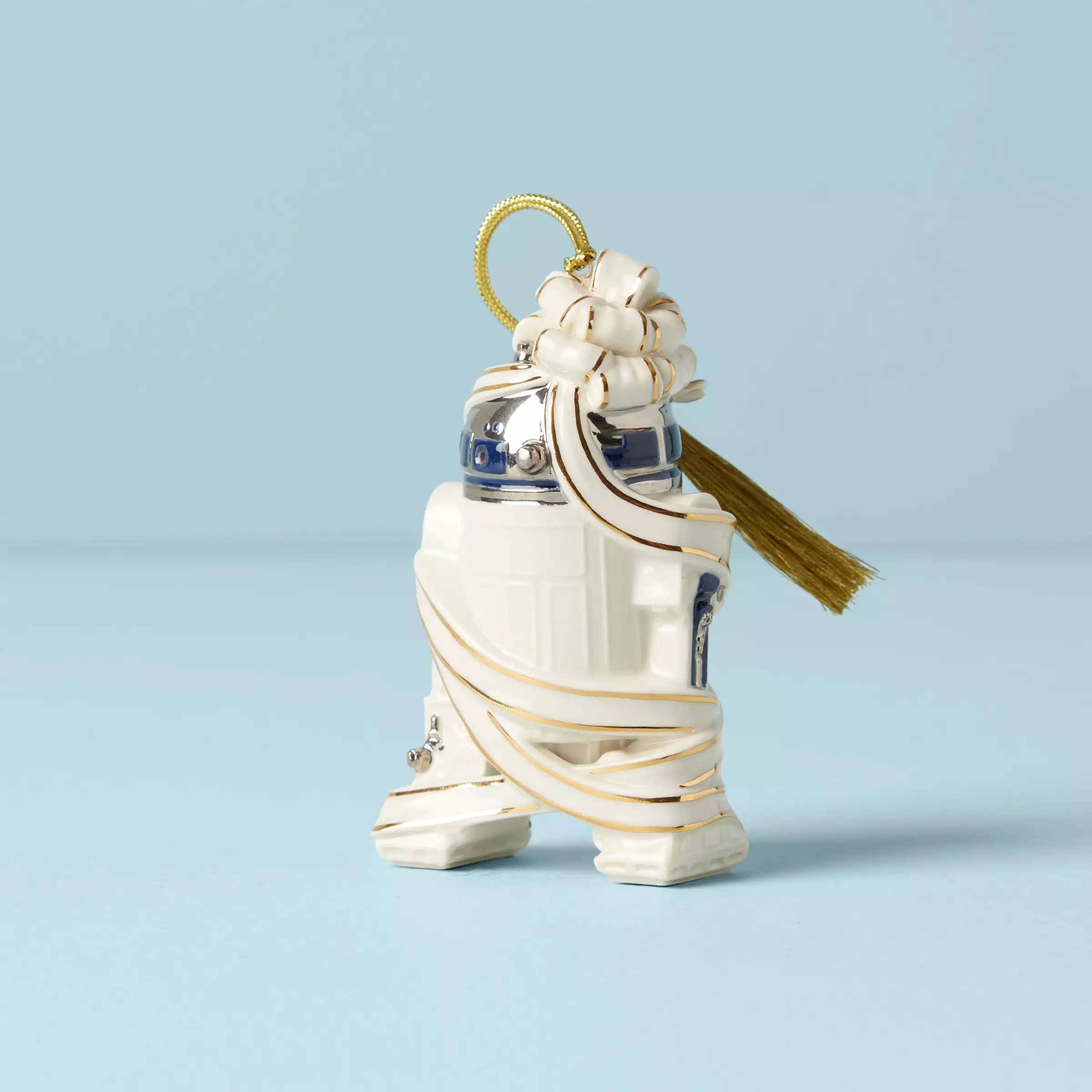 R2-D2 is wrapped up and waiting for the Christmas celebrations to start! This delightful droid is decked out with a gold bow and ribbons, and ready to add some personalized charm to your tree.
