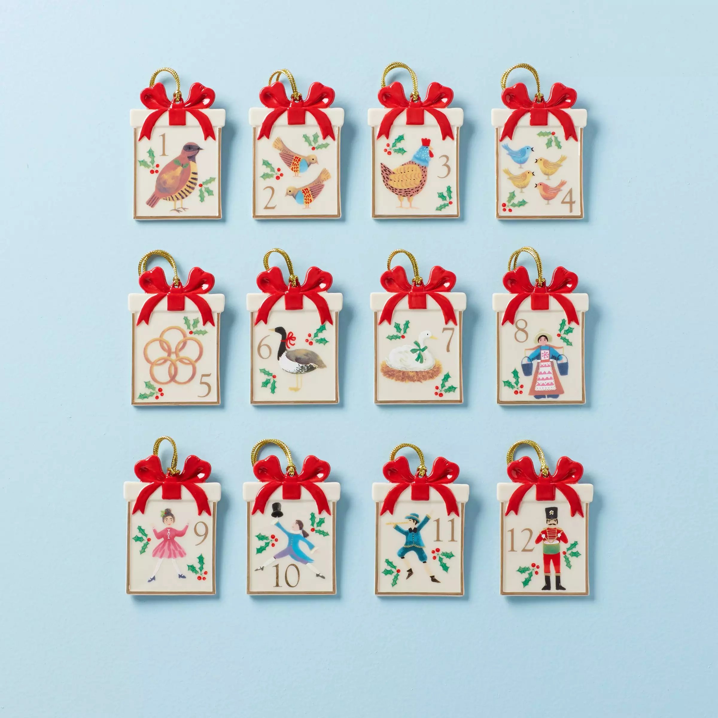 Countdown to Christmas with this delightful ornament set! Each gift box tells the story of the classic 12 Days Of Christmas song. Drummers drum, ladies dance and birds call on their own on these unique, hand-painted pieces featuring 24k gold detail. Decorate your tree with every ornament (or give it to your true love each day!)
