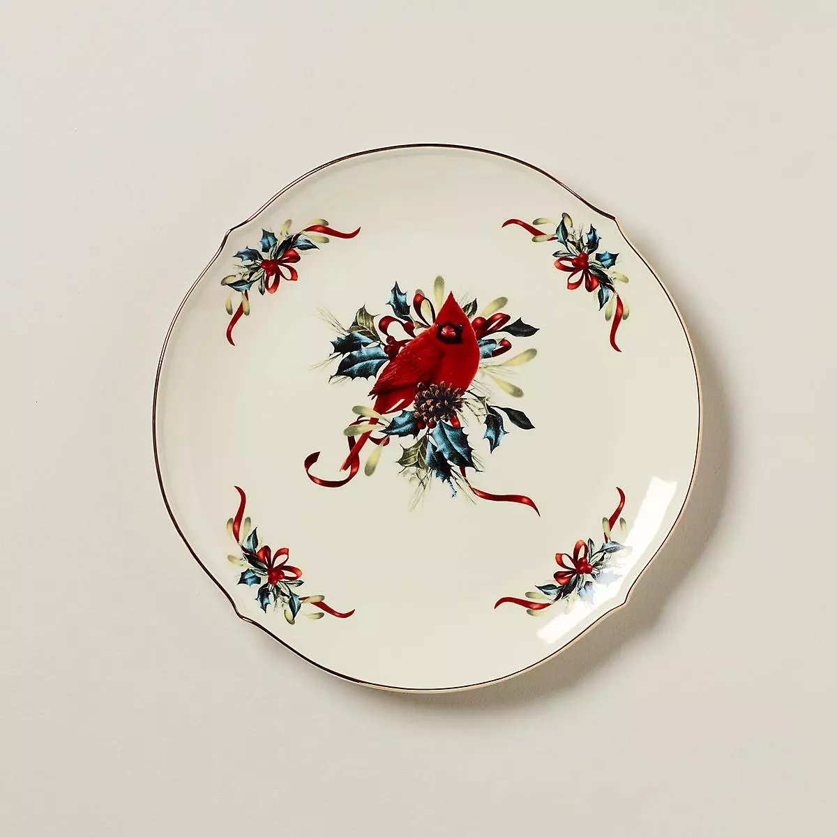 A crimson cardinal sits on a pinecone surrounded by winter greenery on this round porcelain platter. It’s an exceptional choice for serving holiday meals to friends and family. The scalloped edges feature ornate 24-karat gold accents to give it a regal finish.